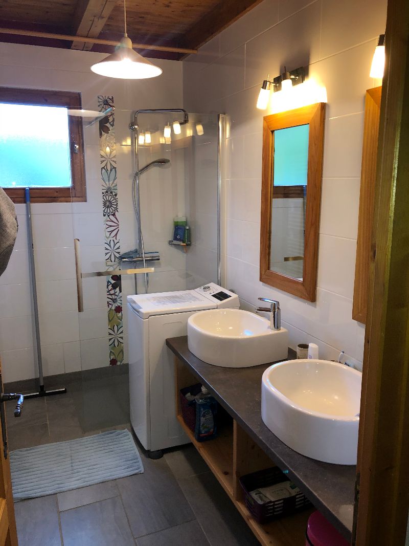 * salle de bain avec douche à l'italienne, deux vasques et un lave linge