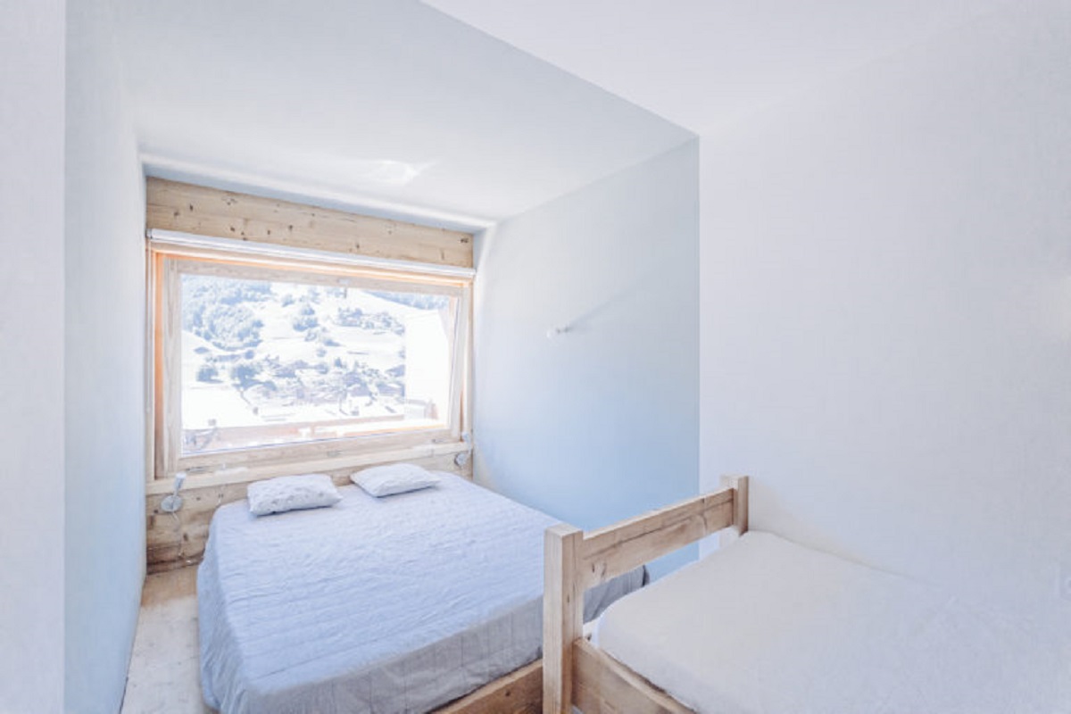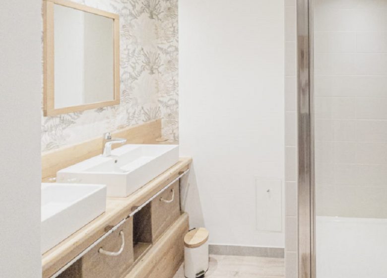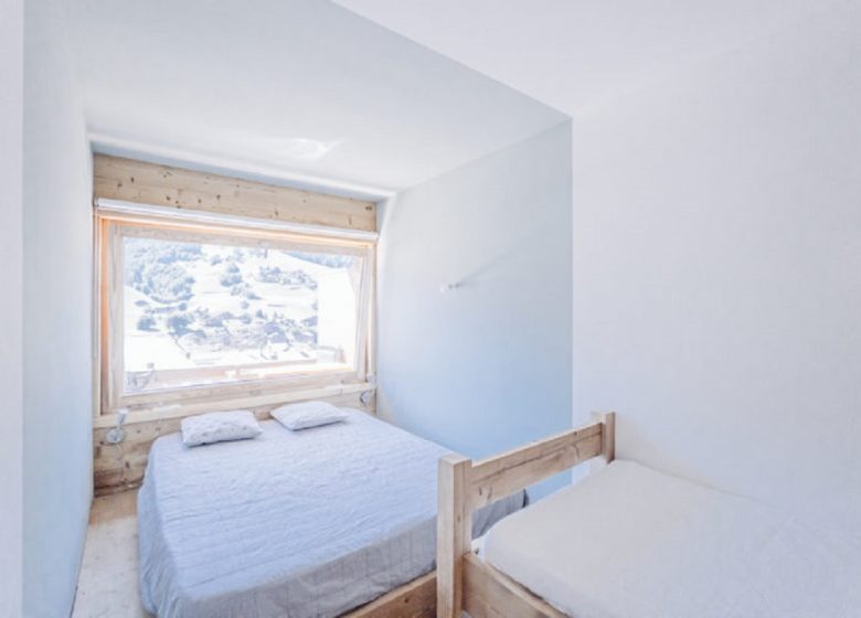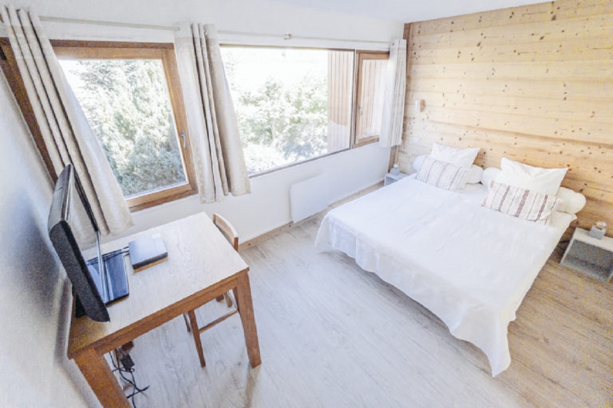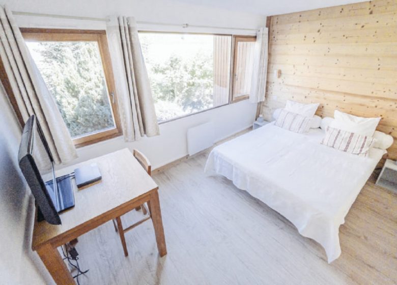 - une chambre avec 2 lits en 80×200 pouvant être regroupé en 1 couchage double de 160×200 ( 2 couettes 150×200 et 2 oreillers 65×65), un bureau, une télé avec lecteur dvd et un dressing,