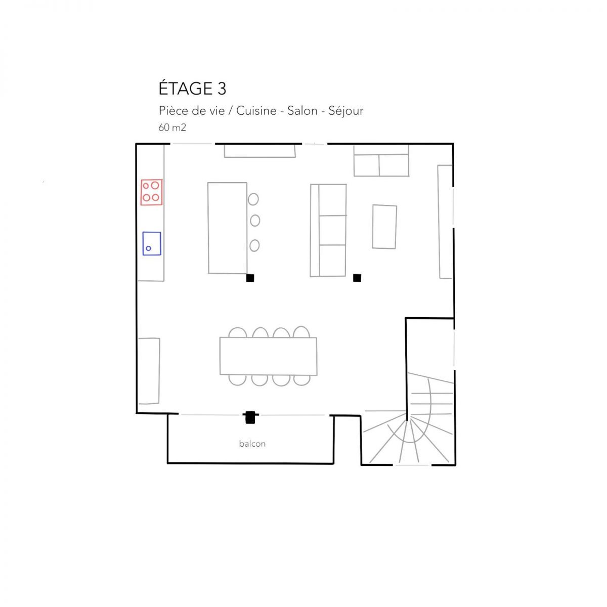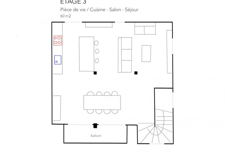 Pièce de vie de 60 m2, vue à 360°, balcon sud.