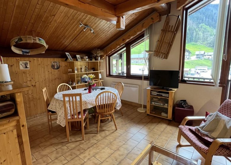 Au 2ème étage bel appartement très confort plein sud 49 m² environ et bénéficiant d'une belle vue sur les sommets au pied des pistes et à pied au village dans petite copropriété de 8 appartements :