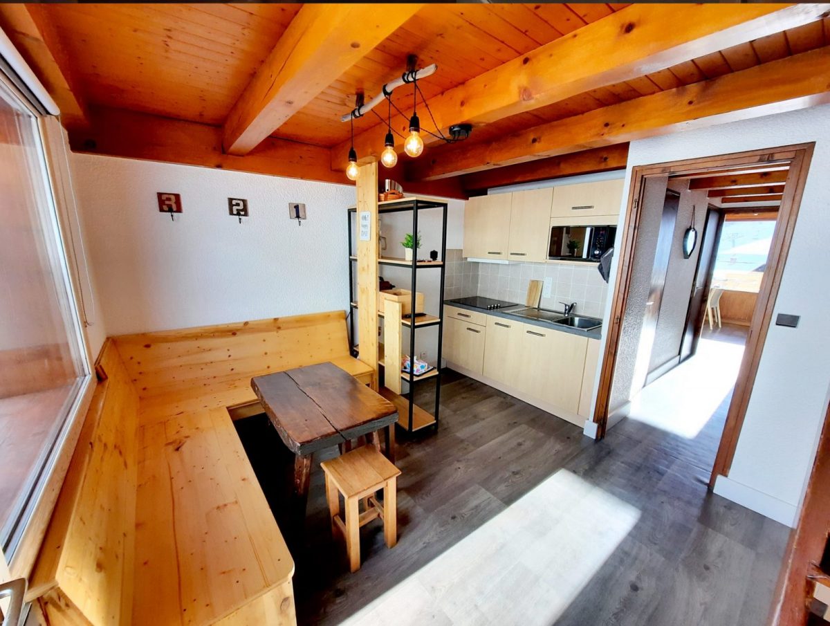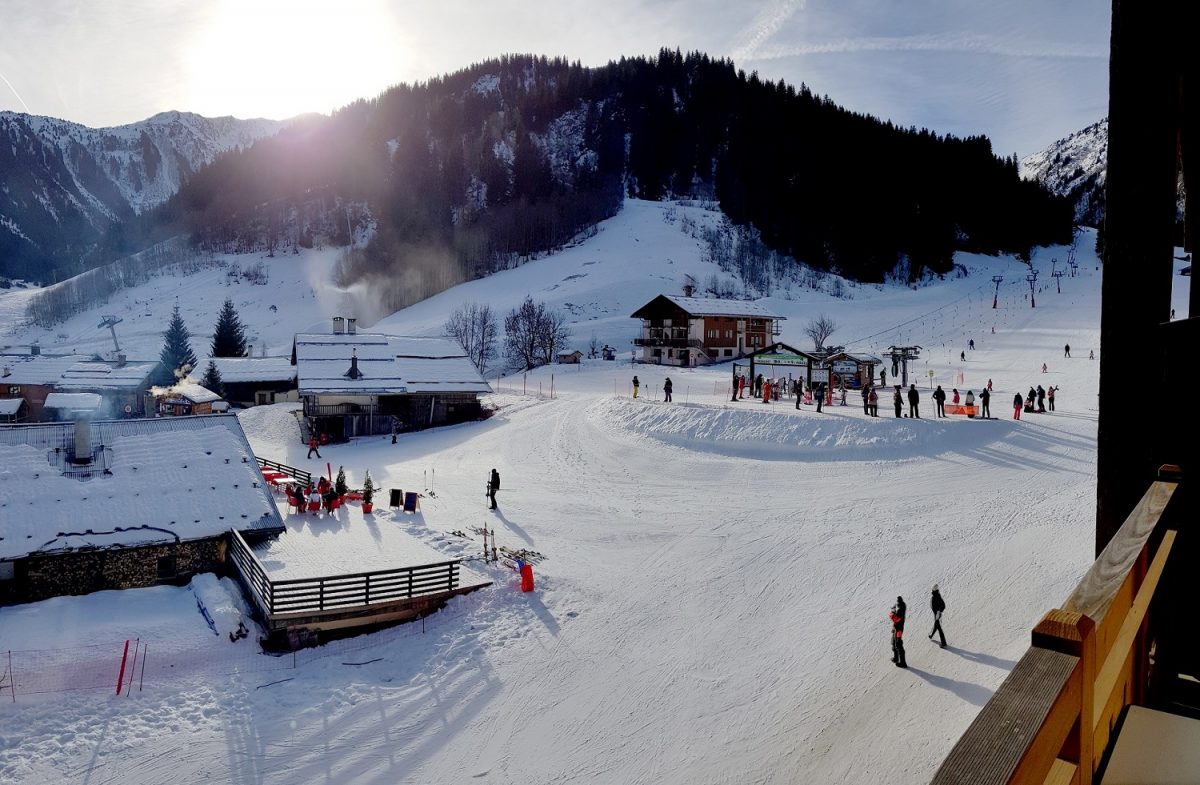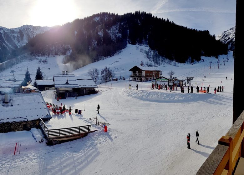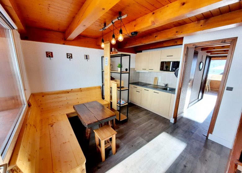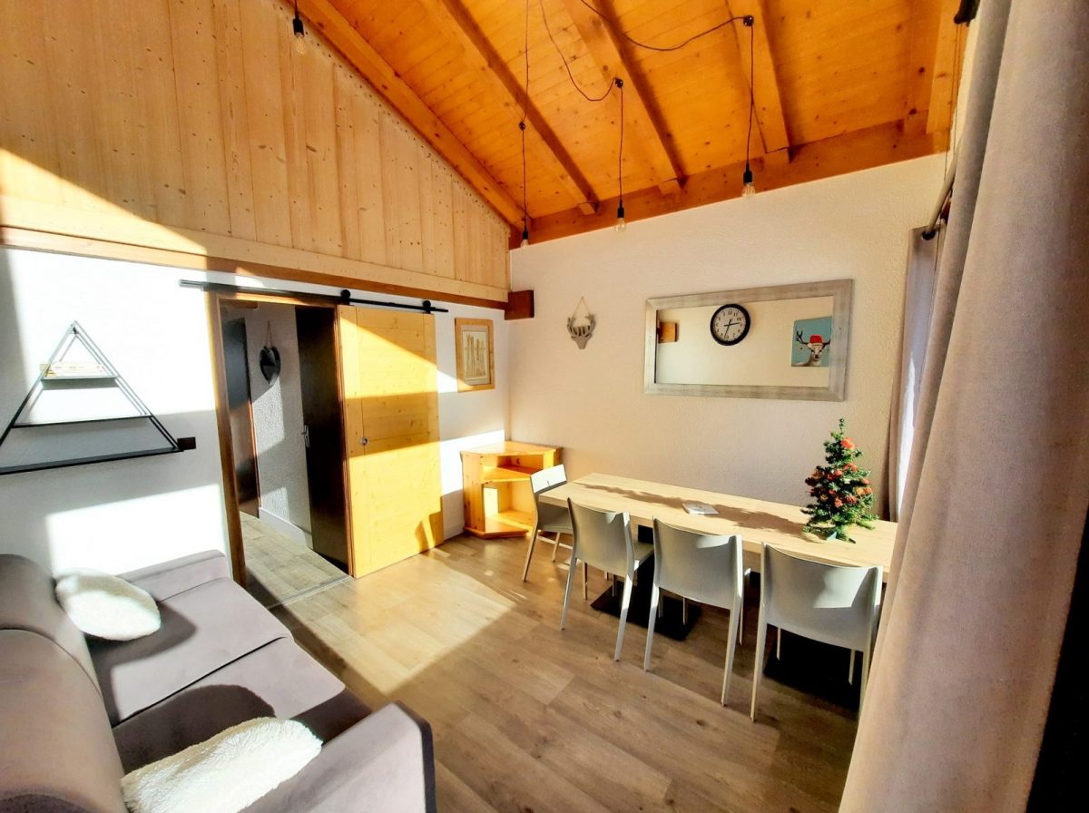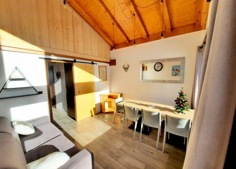 - 1 séjour avec espace repas + canapé convertible pour 2 pers 140x200, côté piste avec balcon.
