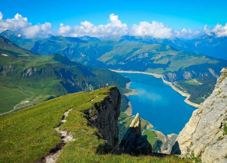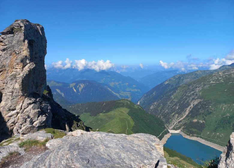 Puis vous arrivez au rocher du vent, dont la forme si particulière semble avoir été sculptée par les rafales des tempêtes hivernales. De là, plongez votre regard vers le lac de la Gittaz qui se cache à l’abri au fond de la vallée.