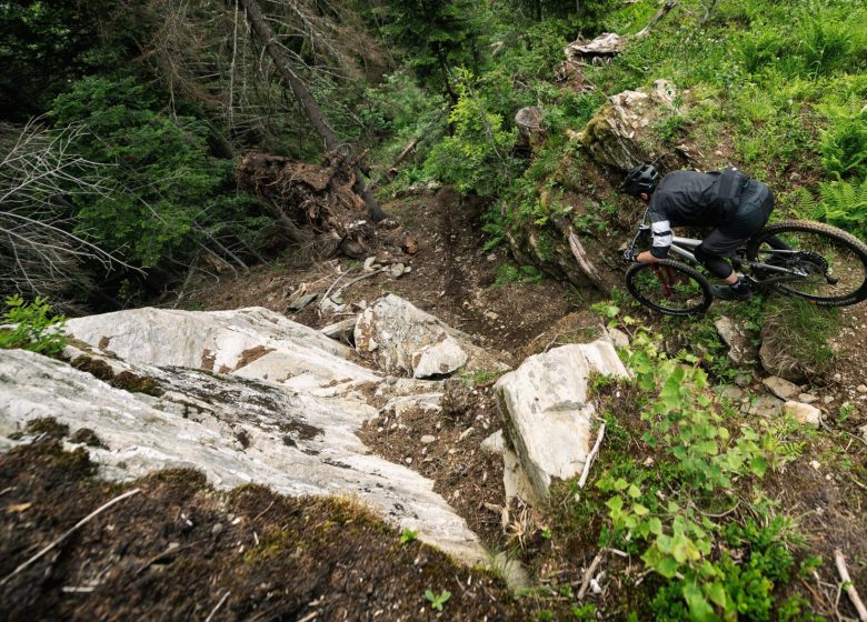 Accès au point de départ par le télésiège du Grand Mont. Court échauffement sur piste forestière puis descente très technique sur “single” en forêt.