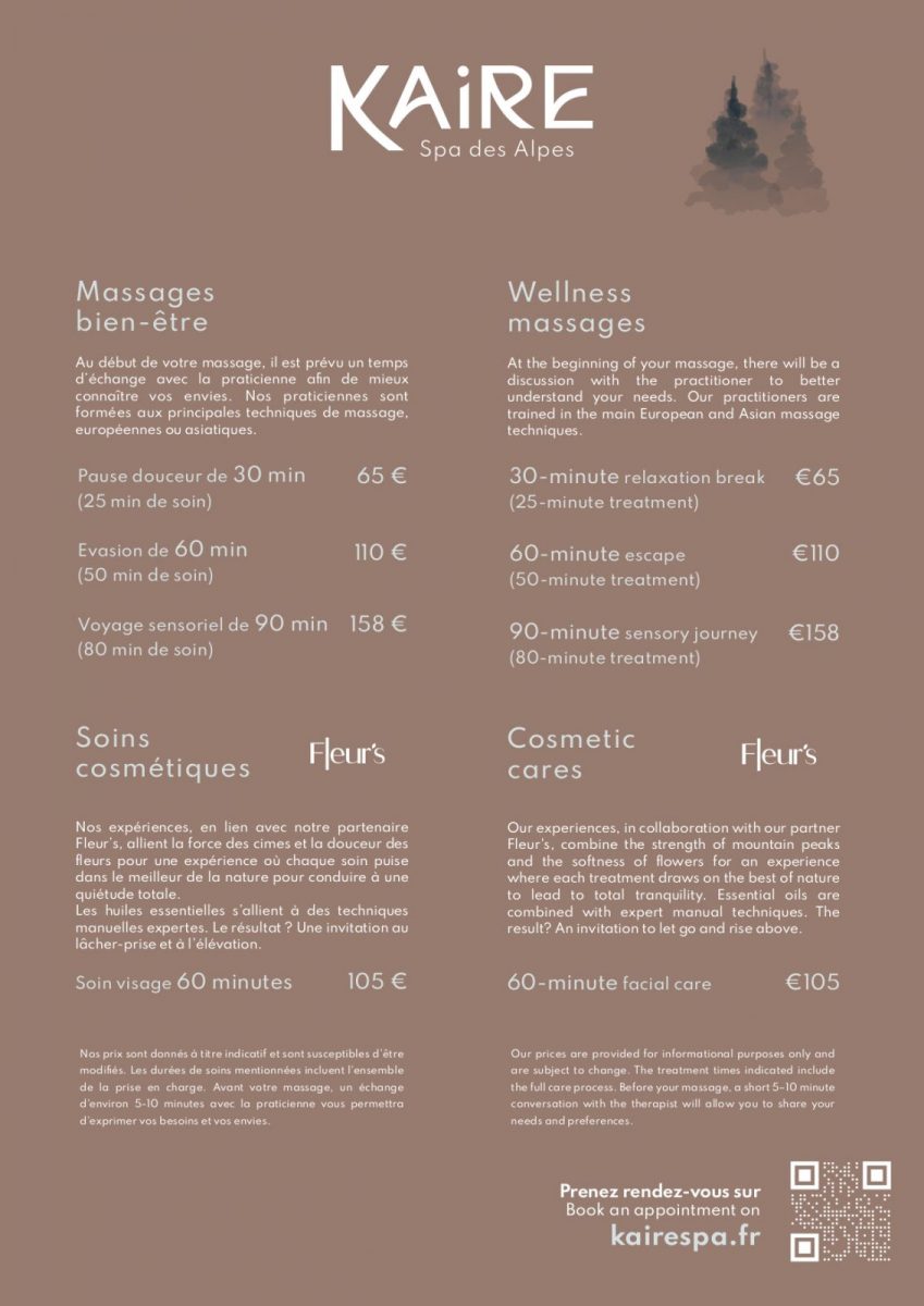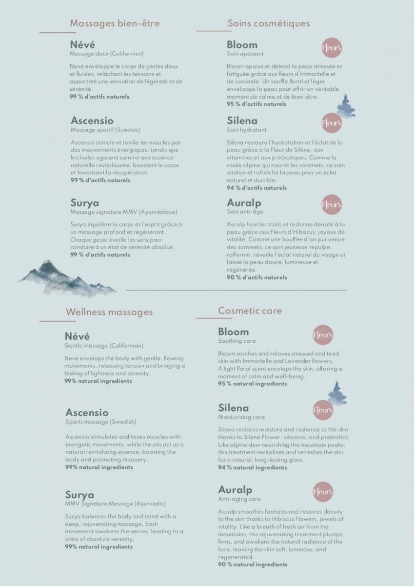 MMV dévoile sa nouvelle marque : KAIRE, une expérience bien-être inspirée par l'esprit montagne. Entre naturalité, douceur florale et apaisement profond grâce aux produits Fleur's, KAIRE mêle la force des cimes à la délicatesse des fleurs pour célébrer un véritable art de prendre soin de soi. Massages bien-être ou soins cosmétiques : sur place, notre équipe bien-être vous accompagne pour vous guider vers le soin ou le massage idéal selon vos envies.