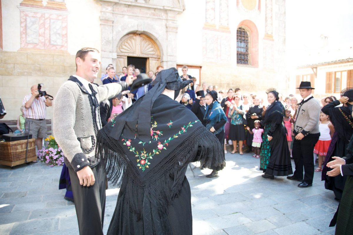 Prestation du groupe folklorique « Lô Vouet’s d’Halteloce » (Hauteluce) sur le parvis de l’église