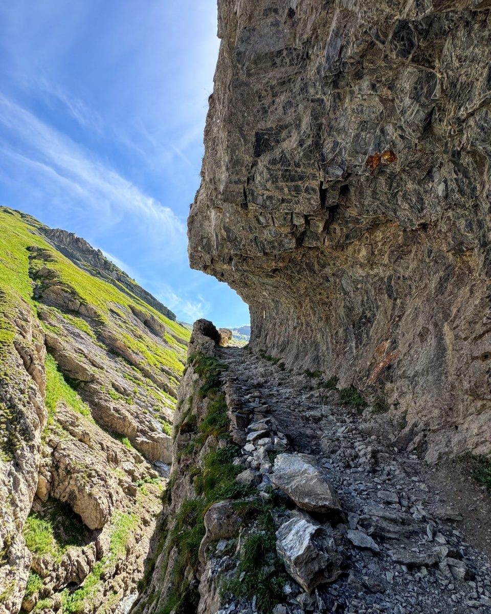 Un peu d’histoire : Ce chemin impressionnant, creusé à même la falaise entre 1891 et 1892, a été réalisé à la demande du chanoine H. Frison, alors propriétaire de l’alpage de la Sausse. Long de 350 mètres et large de 2 à 3 mètres, il surplombe les gorges du torrent de la Gittaz et avait pour vocation de faciliter l’accès aux alpages, jusque-là difficiles d’accès.